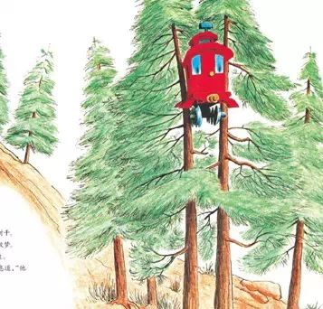 凯蒂从山上掉落,我们估计它要变成一堆废铁了,但作者又安排两棵树卡住了它。