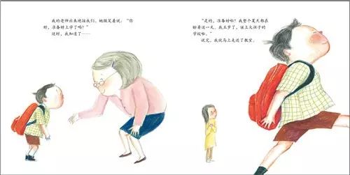 另外,书中还用淡粉色的轻柔温暖质感,展现了一个老师的形象。之前我们提到过父母对孩子上学的各种担心和焦虑。怎么缓解这诸多焦虑呢?我想,父母应该认识到一个问题,就是老师的作用与父母是不一样的——孩子的老师不会像作为父母的你那样,与你的孩子有同样的情感联结,或同样的敏感。那不是她的工作。她的作用是提供一个温暖、让孩子信赖的环境,使你的孩子能在这种环境里培养自信、发展能力、探索世界,并且还能认识到好东西不仅可以来自父母,还可以来自其他人。在这本书中,正是这样一个温暖的老师的出现,打消了小男孩刚刚升起来的一丝顾虑和担忧,让他重新升腾起勇气和自信,大步走进教室,开始自己的新生活。
