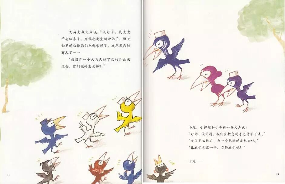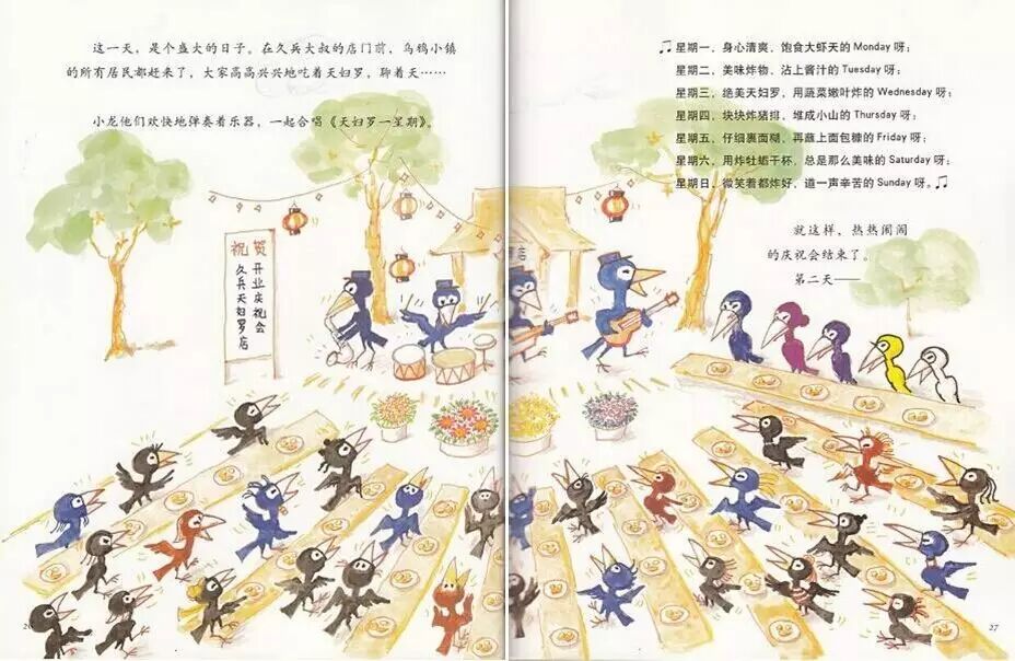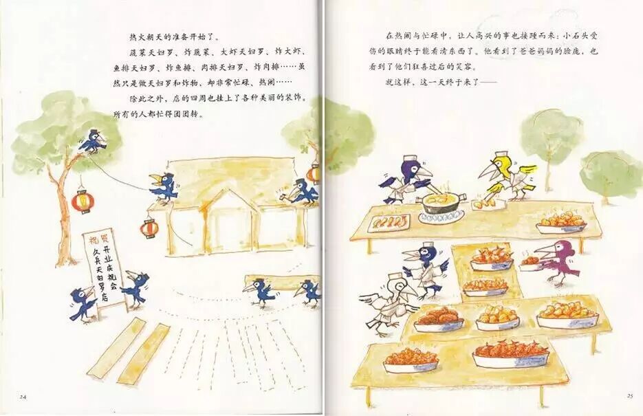 久兵大叔决定开一个庆祝会,宣布天妇罗店正式重新开业。热火朝天的准备开始了,看,每个“鸦”都忙得团团转,每个“鸦”脸上都洋溢着幸福的笑容。