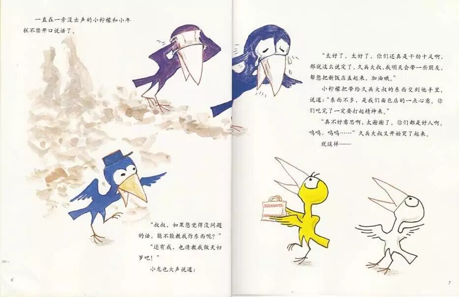 好在天无绝人之路,患难之中见真情。小石头的好朋友小龙和乌鸦面包店的小柠檬小年糕向他们伸出了援助之手。小龙一直陪伴在哭泣的久兵大叔和小石头身边,鼓励他们。小柠檬小年糕给他们送来了面包。