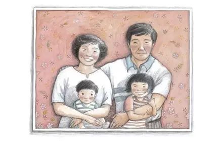 大家可观察一下,这张画里,背景是粉红色的,一家四口表现出来的家庭气氛是非常温馨的,姐姐笑得非常开心。也就是奶奶没来之前,他们过得非常开心、自在。可能大家会提出为什么画面里的爸爸没有展齿而笑,我想这点可能和韩国的文化有关系,在我们的传统文化里也是一样,那就是男人是家里的靠山,哪是能轻易展齿的,他们往往更需要一种严肃的大男子主义的刻画,这是与欧美文化的区别,这里这样画,更贴切韩国本国的文化。这里的爸爸更代表家里的顶梁柱,是这个家的天,他有生活的压力,为什么这么说,我们接着往下看。