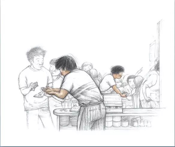 这个时候在姐姐的眼里,爸爸在干什么?妈妈在干什么?大家有没有观察到爸爸的身体是向顾客前倾的,呈半鞠躬状态,而双手是交叠在一起,手心向上向顾客收钱的,这种姿势和动作,都表现出爸爸在生活中的卑微和不易。这是我今天要讲的第二张画。如果我们这里把爸爸的身形改成直立的,单手收钱好不好?为什么不好?这个画面里的顾客是直着身子的,而且面部表情是生硬的,视线从上往下的看着爸爸的头顶,甚至有些看不起人的味道在里面。如果说把这个顾客的表情画成微笑,好不好,也画成像爸爸这样半躬着身子适合吗?整个画面是黑白色的,除了爸爸妈妈的皮肤是土黄色的,为什么这么表现,为什么不画成彩色的,像前面的家庭合照一样?用这些问题让孩子注意到这个家庭生活上的不容易。引导孩子提高对下一页的反应。