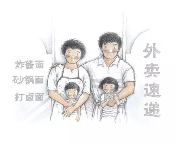 在这一页里,书中第二次出现一家四口的合影,看背景上的文字,大家可以猜出来,这应该是爸爸妈妈经营的饮食店的门口,虽然奶奶是不速之客,但爸妈还是非常隆重的带着孩子站在门口迎接,我们可以注意到大家一脸的无措,而爸爸的手,左手握拳揽着有些情绪外露的姐姐,给予安抚,右手紧抓着妈妈的肩膀,使得妈妈肩部的衣服都起褶皱了,这一动作不但是为了带给妈妈一种安慰,其实更像是一种对他自己的安慰,显示出爸爸此刻内心的不宁静。与画风形成一种冲击。而妈妈是两手张开揽着弟弟,一种全然接受的动作神态。