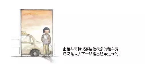 如果没有前一页的铺设,孩子们看到这一句可能不会有太多的思考,坐出租车而已嘛,正因为对前一个画面的讨论与理解,看到这个家庭生活上的不易,孩子们才能产生一种共鸣,真正理解姐姐在这页里所想表达的意思:奶奶是多么的“不体恤”,奶奶是多么的“任性”。从乡下一路搭出租车而不是别的平价的交通工具,甚至没有提前通知这个家庭,在姐姐的眼里,这时的奶奶是一个不速之客。呼应了正文前姐姐说的那段话:虽然妈妈提过一些往事,我还是不明白为什么爸爸和奶奶没有住在一起。