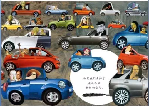 孩子答:他们怎么都把手捂在嘴巴鼻子上呢?还有他们的头都伸到车窗外面来了,这样不是好危险吗?其中有辆车子还是动物在开车,这些车的形状又这样你不觉得这些都好奇怪吗?
