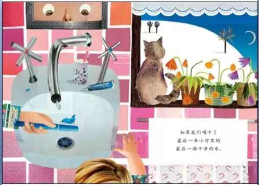 看到图文并茂的这个跨页,给人的第一直觉就是节约水的环保广告。虽然这个绘本的主题本身要表现的就是环保,可环保的概念实在有点宽泛。例如:工业电气至使全球变暖;过度捕鱼至使海洋资源耗损,海底生态失衡;水资源的浪费和工业污染水源危及后代;森林的过度砍伐砍掉了小鸟的家也砍掉了地球妈妈呼吸的肺;空气的污染剥夺了我们呼吸的权利等等。。。。说到环保,我们可以从生活的方方面面都延伸到这个主题的思考,但如何讲才能达到吸引孩子自主思考的目的,个人认为还是需要从具体的事例、与孩子息息相关的事例入手更容易(至少我是这么认为的)。这个页面描述的是是提倡节约用水的图文。除了文字让人心头一紧之外,图上的很多元素都在隐喻水的重要性,以及缺水后的生物状态。