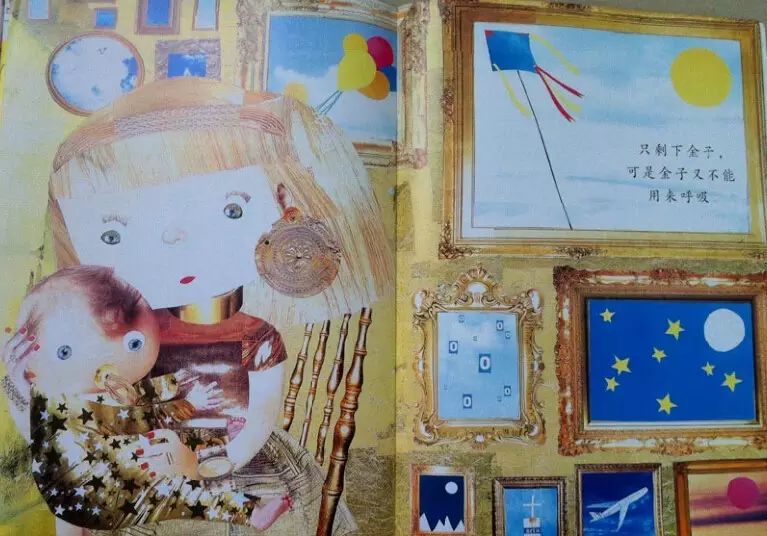 这幅画上的配文:只剩下金子,可是金子又不能呼吸。当我第一次看这个绘本看到这横文字和整个画面的效果时,其实心里感觉是很压抑的。至于具体是什么让我感到压抑,我说不上来。不过,现在仔细盯着那些画仔细看,猛然发现:原来,这个房间里没有窗户。就是少了一扇窗户,哪怕很小的一扇。。。。。