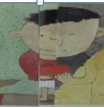 两条分割线把画面分成了三种颜色,但是地面都是一样的,弟弟的那两半虽然颜色不同但是都有同样的点点