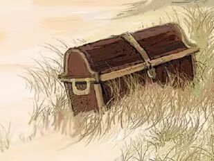海盗船渐渐驶离海岸,两只海鸥在沙滩上悠闲地寻找事物,旁边的沙滩上有一个上了锁的箱子。