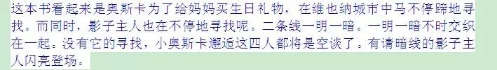 蒋老师一路追随狗狗的身影,才让我们发现,这本书含有小男孩奥斯卡和小狗小粽子的明暗两条线。你既可以跟随小奥斯卡的脚步,也可以跟随小狗的脚步探访维也纳的街头,和充满文艺气息的维也纳撞个满怀。如果这本书中把狗狗去掉就失色很多