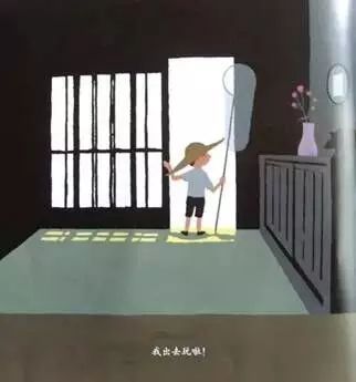 看书评的时候,好多评论都讲,看了这本书,就起了童年的许多趣事,果然,“我出去玩啦!”静悄悄的屋子里,只有小男孩迫不及待的声音。这里作者特意把屋内绘成黑色,黑白的反差让人感觉到屋外的光线是多么强烈。