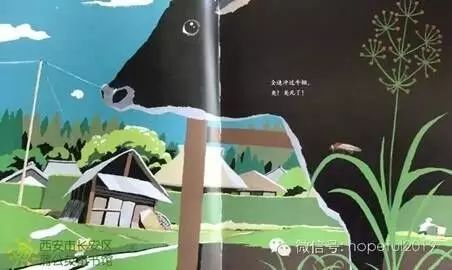 这次是经过村庄。村庄里有牛棚,很臭,在正午太阳的蒸腾下,那种臭味,估计更加浓得不得了。依然是大跨页,近景是大大的牛,远处一个奔跑的小身影。“全速冲过牛棚。臭!臭死了!”对小朋友来说,这可是个笑点。