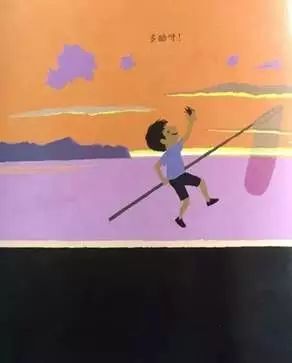 看他的影子可以知道,现在是正午,太阳当空,最热的时候。小男孩却开足马力跑了起来。接下来,跟着小男孩奔跑的脚步,作者一连用了好几个大跨页来展现一连串夏日风情。