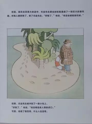 结果,尤金先生被冲到了一座小岛上。“好极了,”他说,“肯定难逃食人族的虎口”。(为什么不是星期五?)可是,他看了看四周,什么人也没有。嗯,确实是什么人也没有,只有尤金先生和他两行孤独的脚印。发现尤金先生是个悲观主义者,但是,每次坏的预测前面,还要加一个“好极了”!