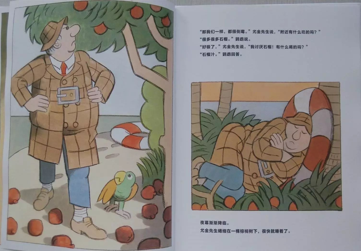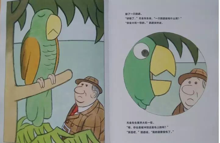 咦,还有一只鹦鹉,闭目养神,很矜持的样子。依然愁眉苦脸的尤金先生说“好极了,一只鹦鹉能有什么用?”“你会大吃一惊的。”鹦鹉突然说。果然大吃一惊,鹦鹉会说话不惊奇,会和人对话,是挺让人惊讶:“嗯,你也是被冲到这座岛上的吗?”“算是吧,”鹦鹉说,“我的翅膀受伤了。”看来尤金先生受的惊吓还不小,都没用他的口头禅“好极了”。