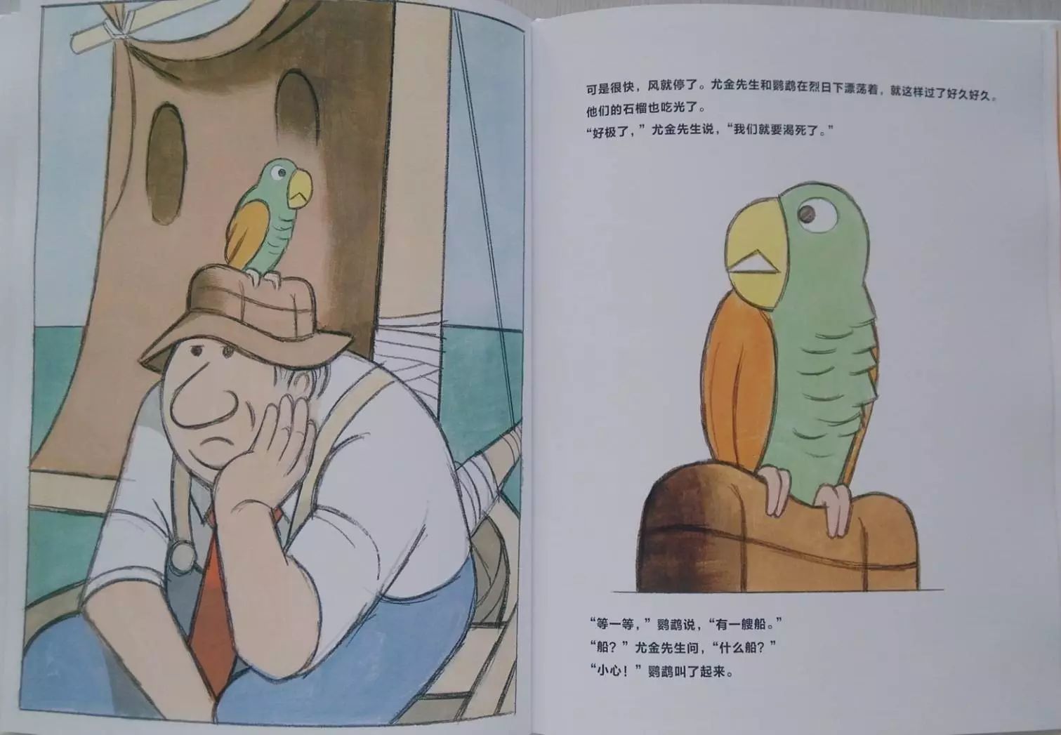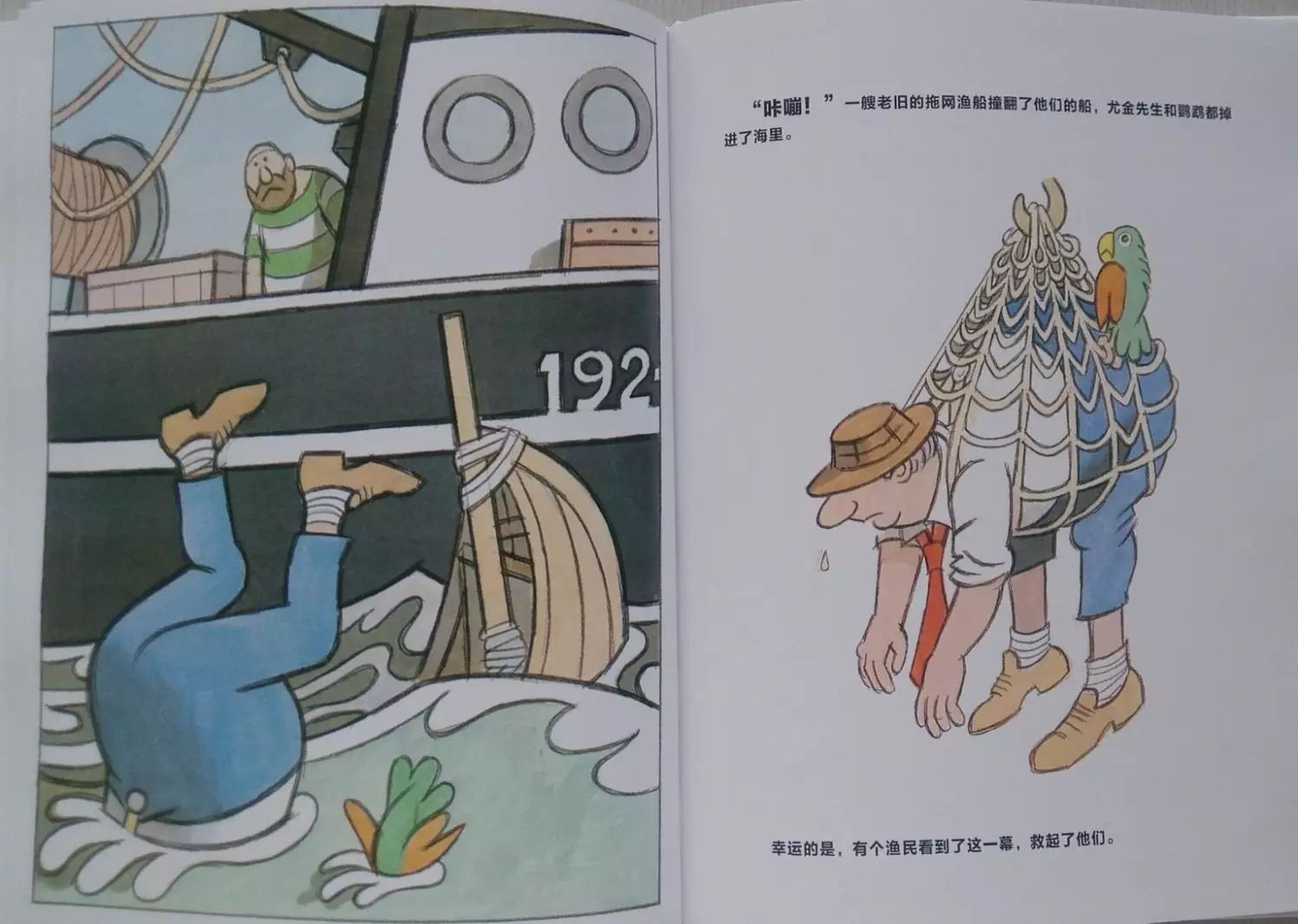 都不是,只是因为他们的船太小了,任何船都能把他们撞翻。“咔蹦!”一艘老旧的拖网渔船撞翻了他们的船,尤金先生和鹦鹉都掉进了海里。幸运的是,有个渔民看到了这一幕,救起了他们。