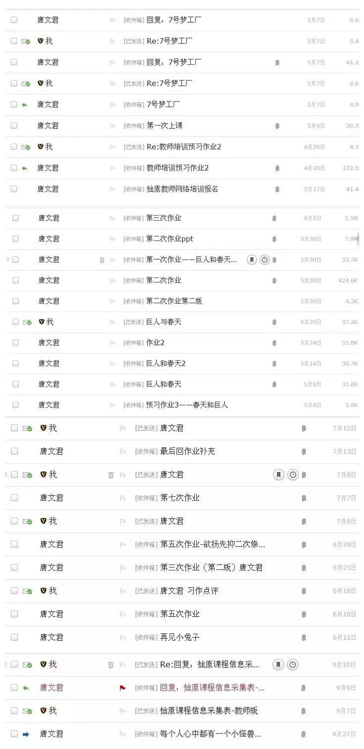 1、2015年3月至9月,和唐文君老师33封邮件往来。教培期间,唐文君老师6次高分精品作业+3次绘本精读分享,荣获教师培训奖学金1000元人民币。