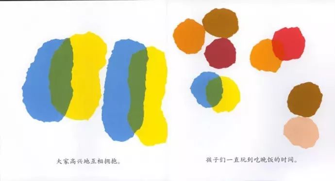 这个故事听起来简单极了,不过在给孩子读完后,一个孩子翻动着书页,抬起头来问我:“这里的颜色以前没有拥抱过吗?”