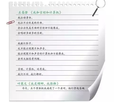 就是这场讲座,令我被大猫的解读视角深深吸引了。我记得自己当时心中暗暗赞叹,这必是泡在绘本世界多年,又有一双与众不同的观察之眼,一颗爱孩子、懂孩子的心,才能生发出对Goodnight Moon那样的创意解读与想象。而且,在这场讲座中,大猫展示的她那些学生创作的作文,极具灵性,一看就是没被“优秀作文选”之类的书荼毒过的。比如: