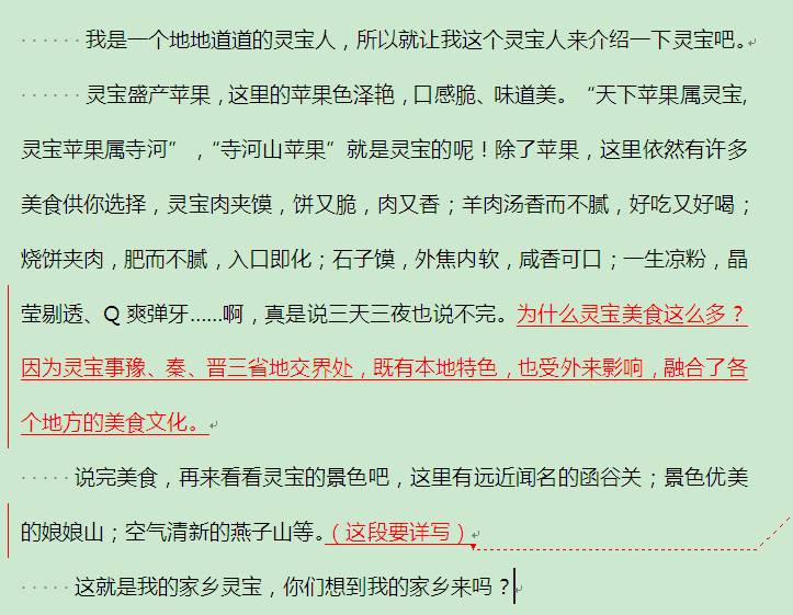这位同学介绍了灵宝的吃——景,之后又一个回马枪提及了吃,尽管第二处出现的吃是为了体现灵宝特别的地理位置,但还是让读者觉得不够清爽,运用巧挪移之后,文章有了一定变化。