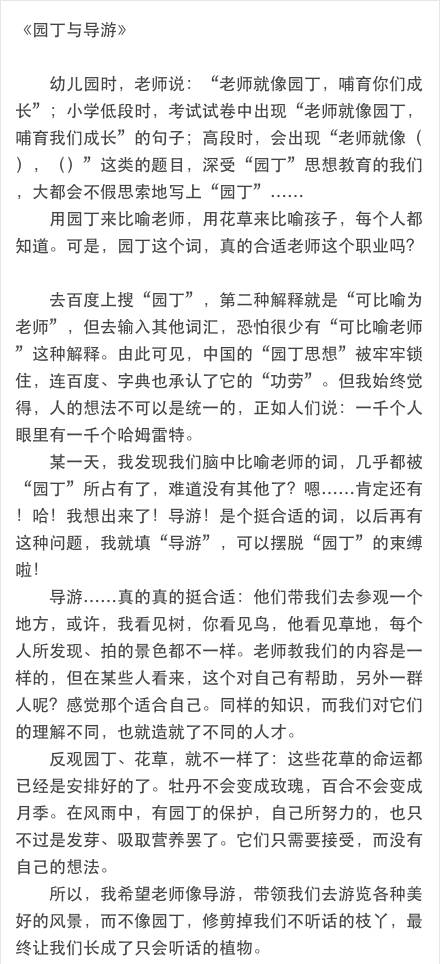 这就是一篇心声流露的作品,第一段中小作者简单地交代了下激发心声的原因,其余篇幅畅快淋漓地挥洒了心声,读罢,相信每位读者都懂得了她的心意。