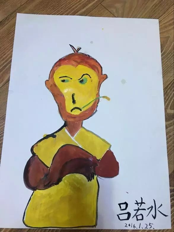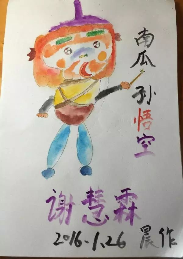如果说上两幅是写实的悟空的话,谢慧霖的作品就是充满了童趣的大圣。蔬果一般的五官,水彩融合且呈南瓜状的毛发,变为魔杖的金箍棒,糊满一脸的食物,无不透着南瓜悟空的毛躁与可爱。