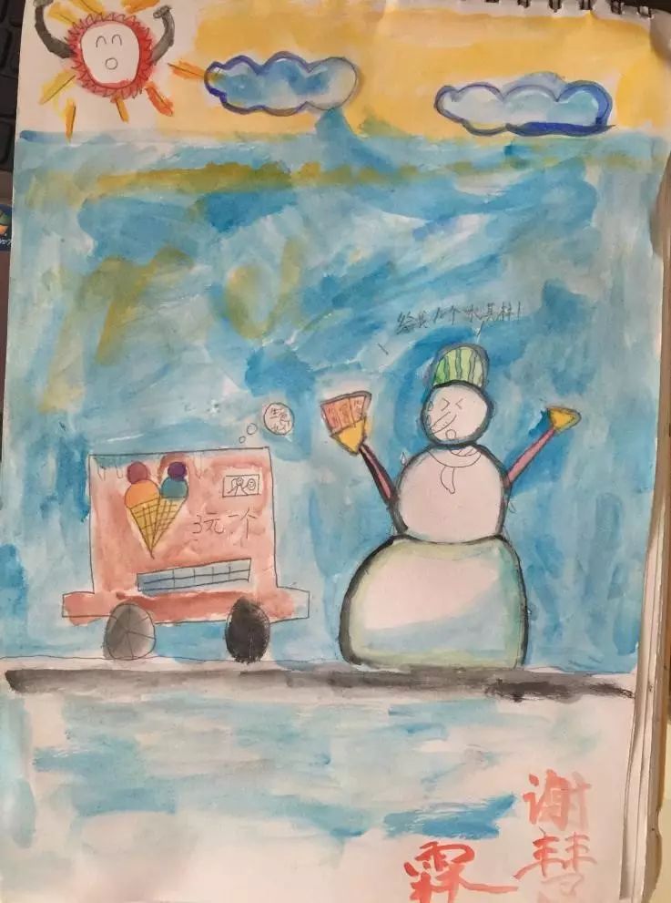可能是春天快到了,冬天的蓝色已无法抵御头上春天的温暖,冷暖色的对比凸显了这一变化。谢慧霖的雪人用焦急的表情告诉老板,我要打十个!!哦不,我要吃十个冰棍。