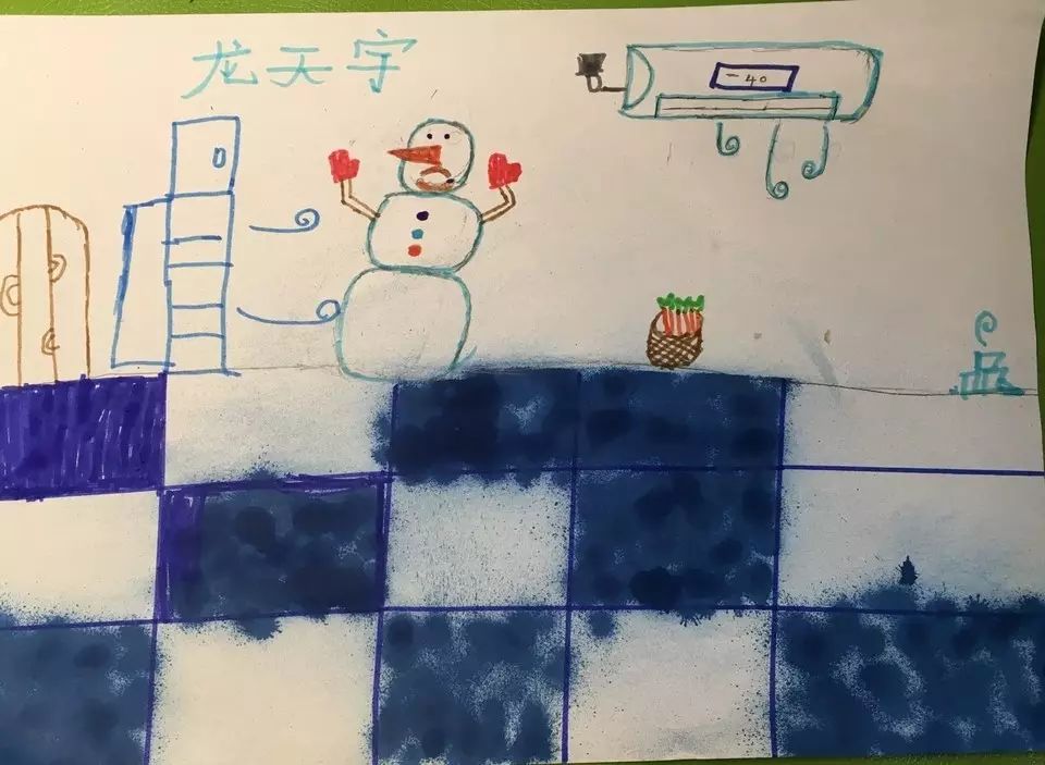 龙天宇的画面简洁,不失和谐,为了不过于呆板,地板有意或无意拼错了一个。你们能从雪人的表情上体会到零下40的空调以及把冰箱当“壁炉”对于雪人来说是一件多么幸福的事吗?