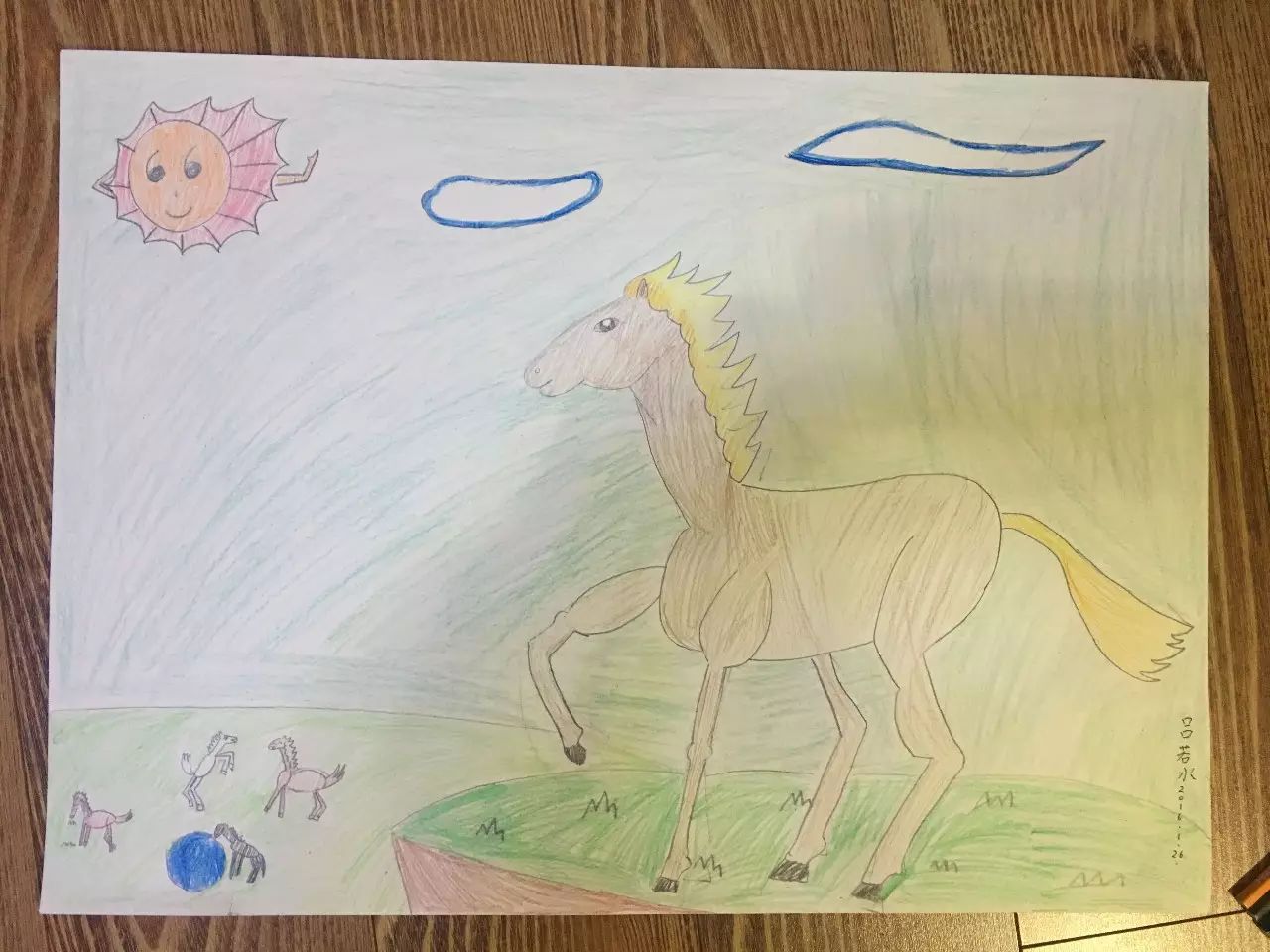 吕若水的马较为苗条,马的结构特点能够有所把握。课上她注意到马是群居动物,课后能立刻将马的这一特点展现在作品上,可谓细心而用心。山坡上的马王看着远处马儿们的嬉戏,安逸得让人为之动容。