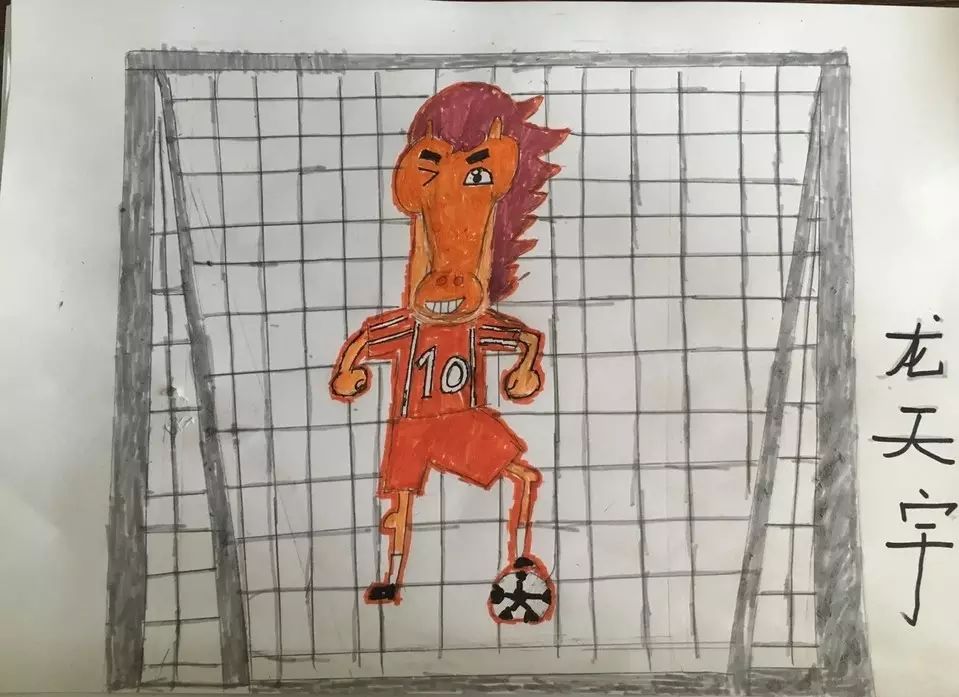 会画讲究多风格,百花齐放,龙天宇的马足球守门员画出了潇洒的姿态与自信的表情,同时兼顾了马的的自身特点。当然龙天宇不是唯一,还有一位小朋友的马的卡通运动员作品同样很精彩。