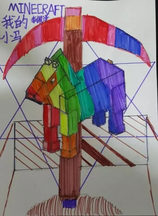 李佩泽的画没按影子老师的课堂解说来画,不过这完全不影响他的画5作为一副优秀的作品。minecraft风格看似简单,实则很难将马这样的立方画的好同样需要下一番功夫,同时立方块的表现如果将不同面的深浅颜色做出区分将会更完美。