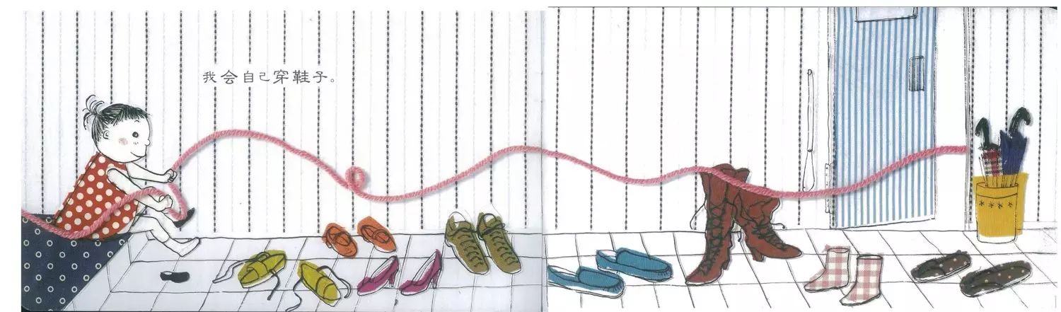 2、她把粉红线伸长像是准备拿伞一样,粉红线变得越来越长,接着她看见地下有好多鞋,她将粉红线串到鞋里想用来整理鞋,可地下还是好乱。红红脱下鞋换上运动鞋准备出去散散步。