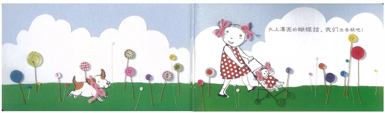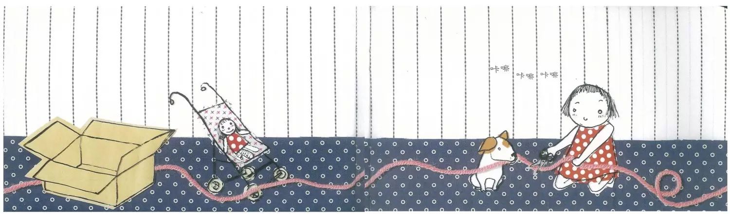 12、红红用粉红线给自己、布娃娃和小狗做了蝴蝶结和围巾,红红带着小狗和手推车里的布娃娃一起散步去了。一路上,他们说说笑笑开心极了。