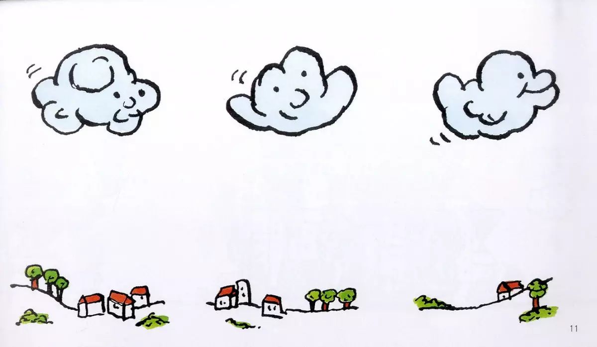 我们的最后一课使用了绘本《一朵小云》,通过一周的交流学习,小朋友已经可以在一幅跨页中看到很多,再加上自己的想象,一页书就变成一个完整,生动,曲折的小故事了!