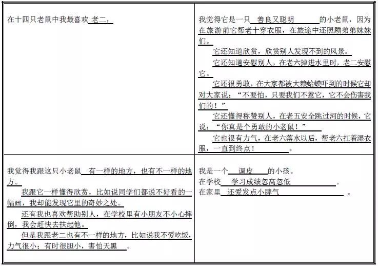在14只老鼠中我最喜欢小九,我觉得她是一只好奇的小老鼠,因为她一路都在问问题。刚进入森林,他就指着树上的鸟儿问哥哥:“哥哥,鸟妈妈在干什么?”哥哥回答:“鸟妈妈在喂鸟宝宝吃饭,鸟宝宝太小,还不能自己捉虫子吃。”走到森林深处,她又问姐姐:“姐姐,那丛紫色的小花叫什么?”“那是紫罗兰。”姐姐告诉她。在原野的小路上,小九指着空中的飞虫问:“那是什么?”哥哥回答她:“那是蜜蜂,春天来了,花开了,小蜜蜂都出来采蜜了。”走到河边,她看着河里长长的像蛇一样的东西问是什么,爸爸解释说那是青蛙的宝宝。