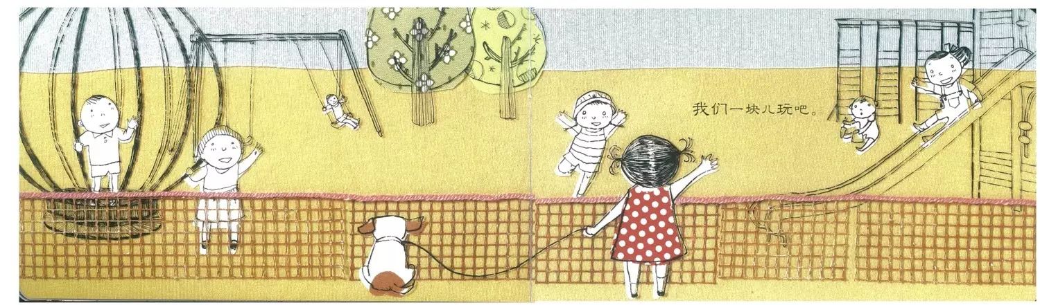 红红和小狗来到公园,红红看到小朋友们,说“嗨,大家好!”,小朋友们说:“红红,要不要一起玩啊!”小狗说:“这么多好玩的啊,我现在就要进去!”