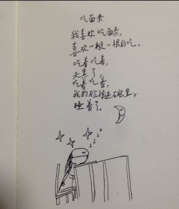 《吃面条》这首诗真是可爱,是雨灿小朋友创作的,这面条是多么地美味啊,一根一根的吃,直到月亮星辰升起,所以我们叫它”催眠面条“,也有朋友称之 “神娃神作“,嗯,毫不为过!