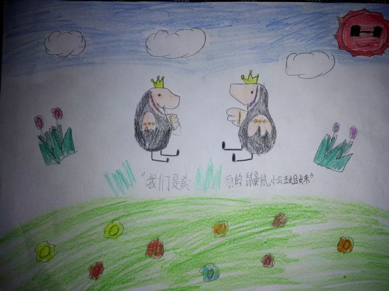 有皇冠的鼹鼠姐妹,亮点就在她们身上,小朋友很有观察能力,画出了很形象的她们。让这张背景有点典型意味的画变得很不同。草坪相当奔放啊,云和太阳则很搞笑。