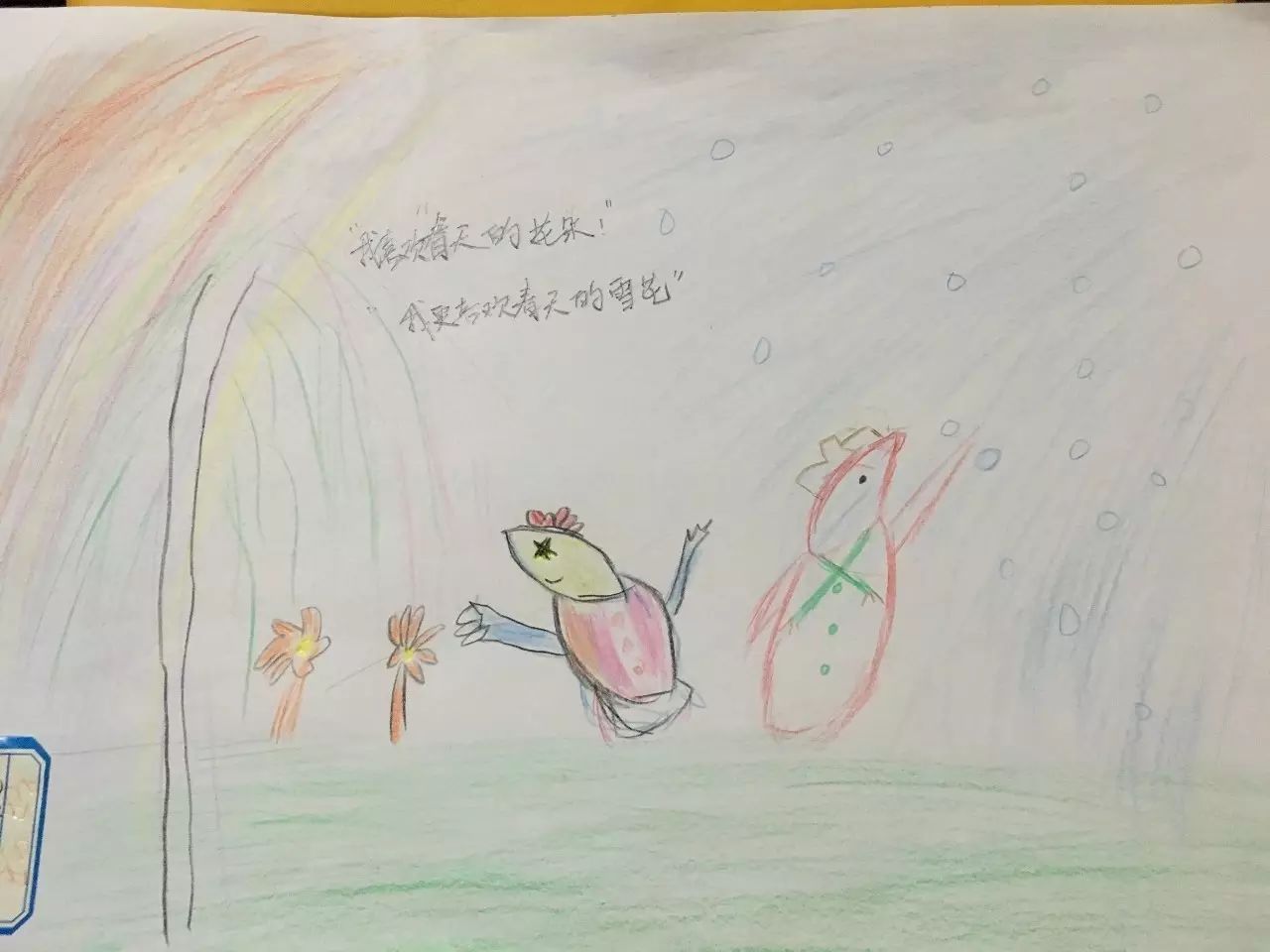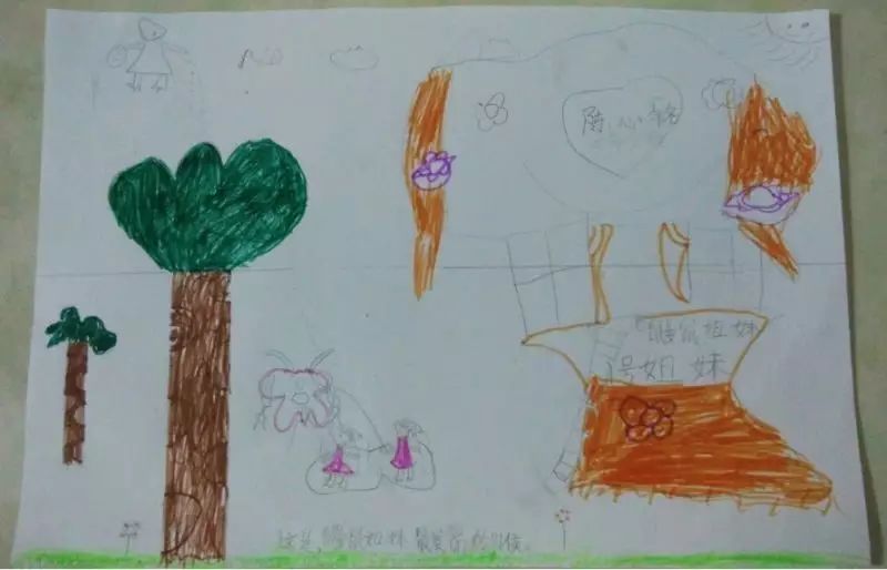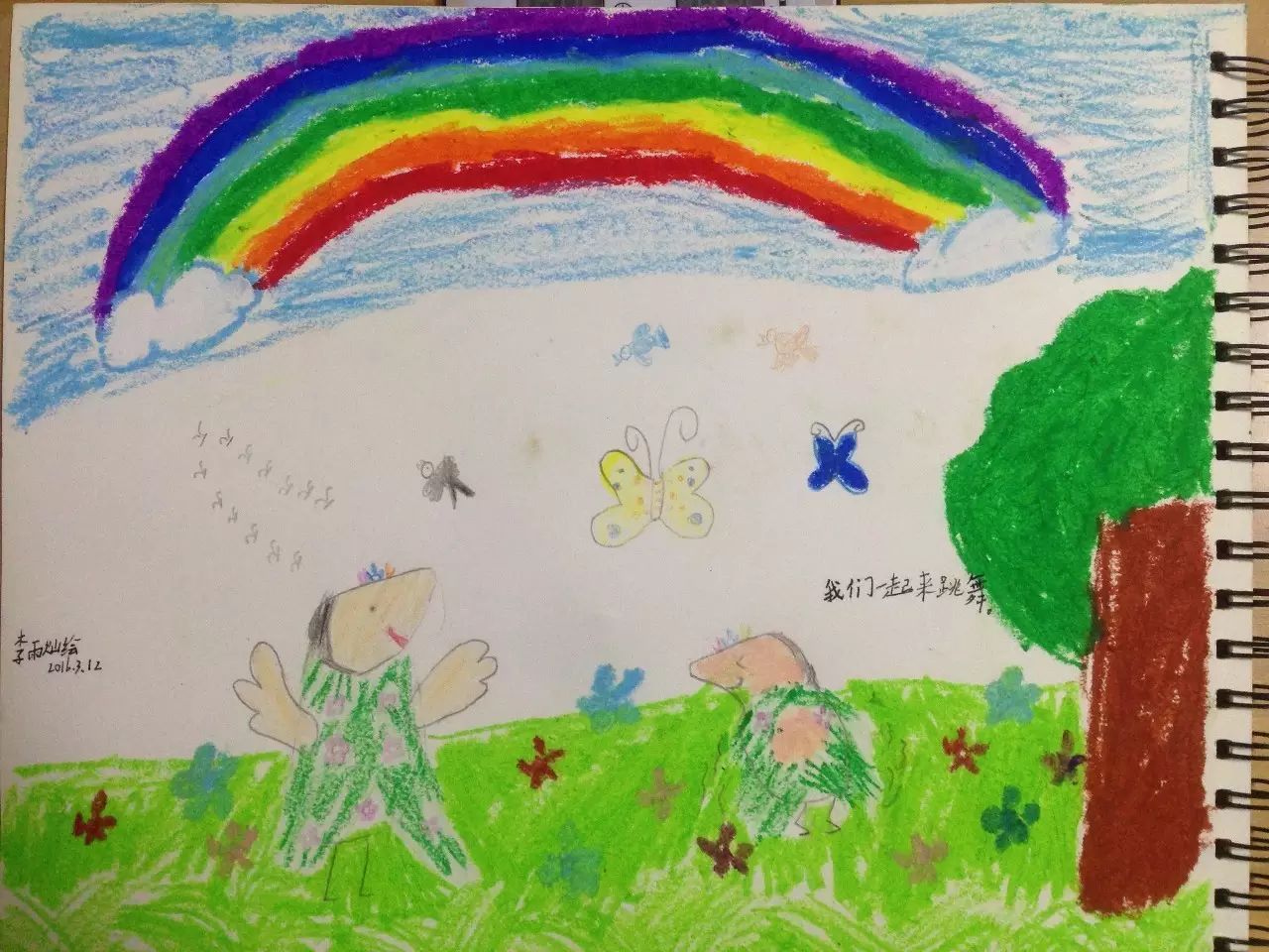 彩虹感动到我,毫无保留的色彩。色彩浓烈就是小朋友的作品中天然的一面,鼹鼠姐妹变成了绿色,与草地浑然一体,啊,这就是传说中的:春天来了!花和蝴蝶很巧妙,让画面活起来,又不至于很琐碎。