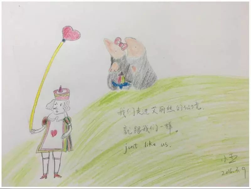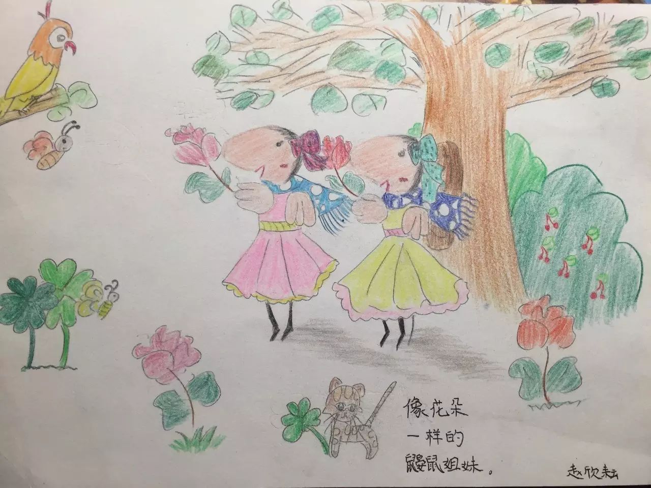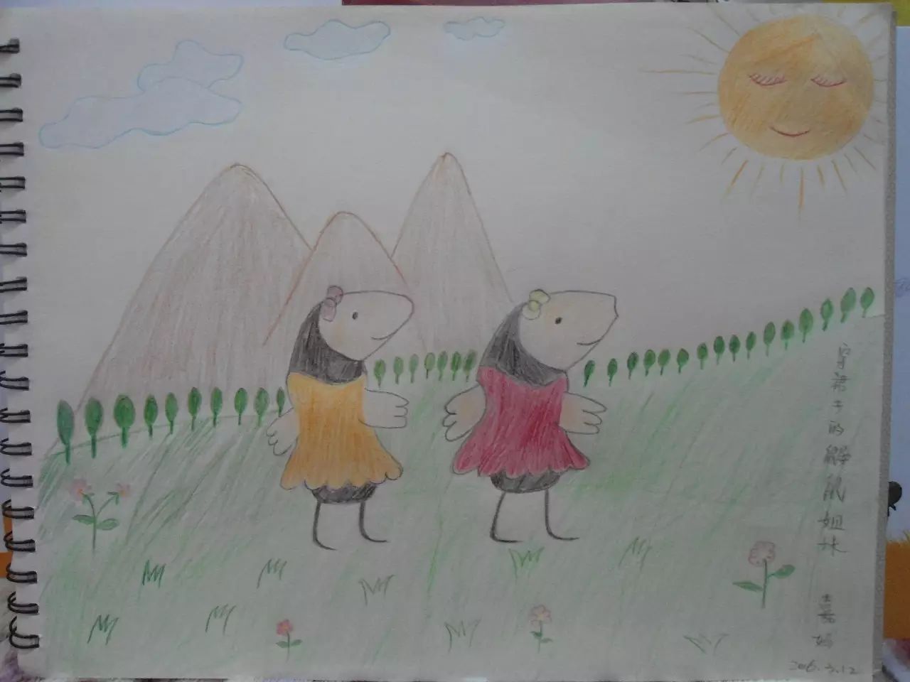 闺女看到画的第一眼已认出我画的是花婆婆中的场景,听了我的讲述马上动笔。我说:远处的鼹鼠画的有点小,闺女说:妈妈你不知道近大远小么?哦,我又说:近处的鼹鼠也有点小哦,闺女说:妈妈她们是姐、妹呀!(言下之意近处是妹妹)好吧,妈妈没意见,点评就交给画家老师吧。
