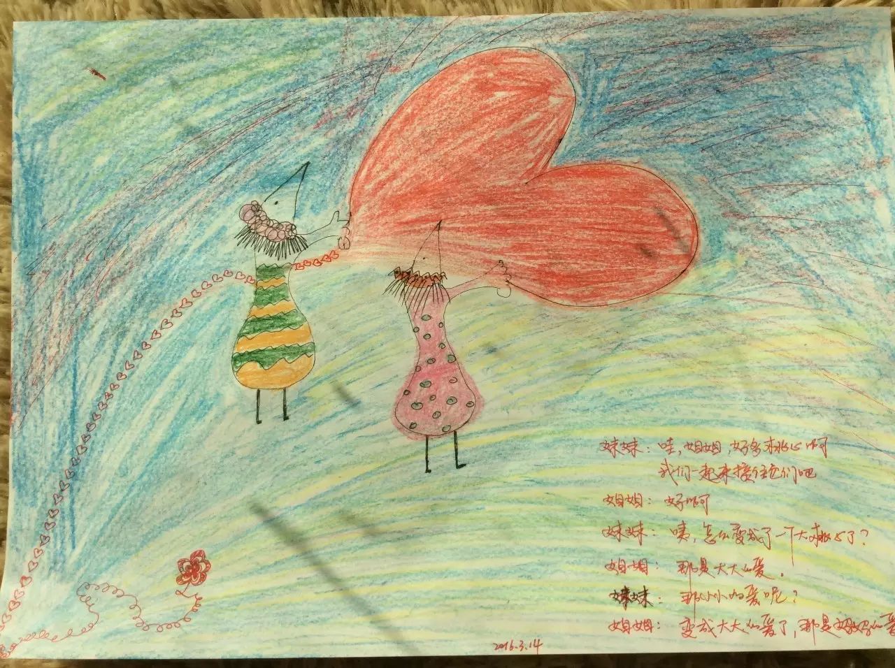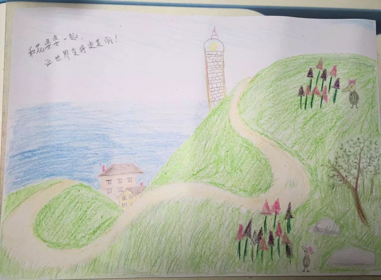 “美好的事物总要在一起,老师在讲鼹鼠姐妹的时候,我就想到花婆婆,这是我最喜欢一个绘本,无论画风的唯美和超有爱的故事都深深的打动我,结合两个故事我完成了这幅画。从没真正画过画,在完成轮廓和底色后,求助闺女帮我添加鼹鼠姐妹。