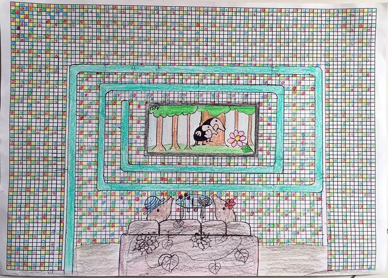 这周太忙,周五回到家才准备开始写这项作业,问儿子有没啥建议,他盯着我家的电视说:画鼹鼠姐妹在像素世界看电视吧,我赶紧趁热打铁:愿意帮我完成吗?你来画我来涂色,刚好你画的时候我可以帮你给你作业涂色。结果就泪奔了!昨晚人家10点睡着之后我勾线,涂框到12点多没完成,早上少爷看到说:中间空白处太多,我又开始打格涂色;少爷又说:颜色太绕眼了,你留一些空白吧。幸亏啊,谢天谢地,否则都涂完我今天真的要倒地了。结果少爷又说:这个不是我想象中的像素世界,干脆叫:鼹鼠姐妹在俄罗斯方块世界看电视。怎么都行,只要别让重画就好。