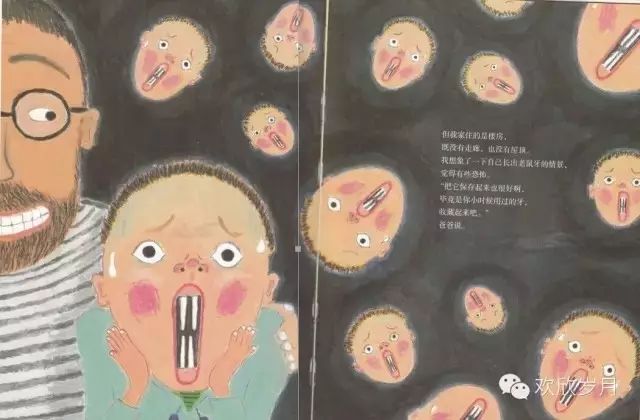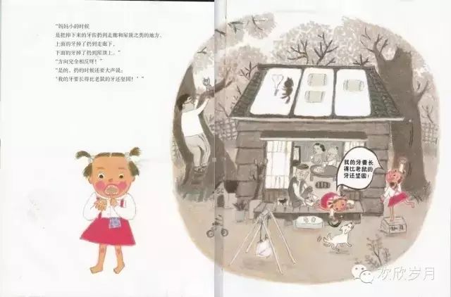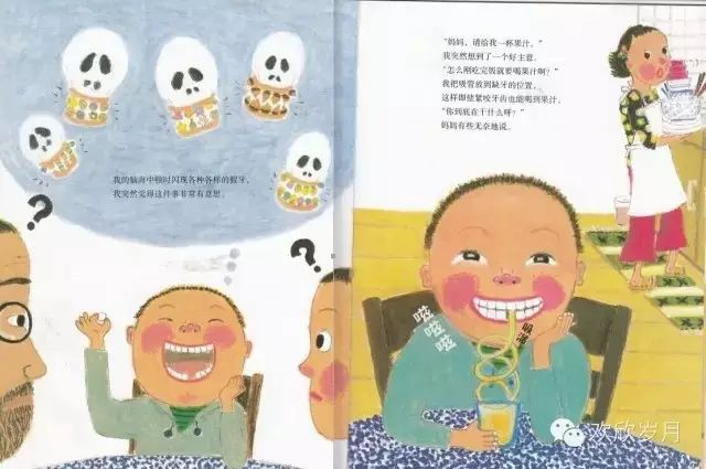 当父母与孩子说话、思维在一个频道一个地球时,此时的对话才是对话,妈妈说小时候扔牙时,一定要说一句祝愿,“我的牙要长得比老鼠的牙还要坚固”,这句话带动了情节进一步深入,将幽默进行到底!儿子幻想自己长出老鼠牙的图画真是百看不厌啊!