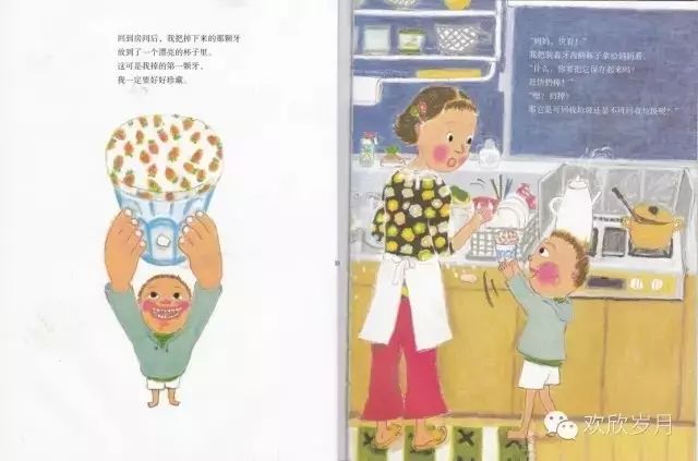 右图一张婴儿肥的娃娃脸出现在我们面前,“用一颗玉米粒充当牙齿”,玉米粒熠熠生辉啊,如一颗钻石照亮孩子的童年。