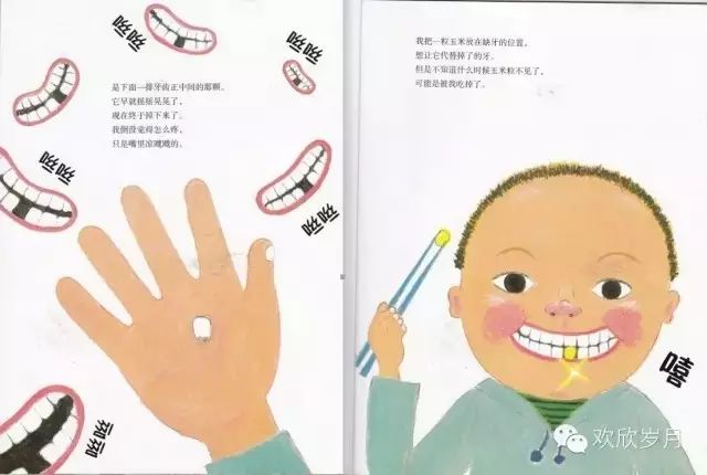 左图是手上托着一颗牙,一张张缺一颗牙齿的嘴,配以文字“咝咝”声,呈现了小孩子因为第一次掉牙的开心与好奇心,他一遍遍呼吸,感受风穿过牙齿缝的飕飕凉意,体验成长的神奇。