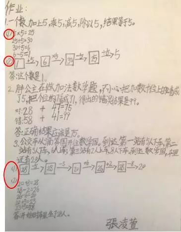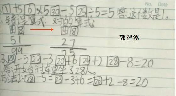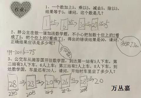 可以看出,郭智泓和万丛嘉小朋友对于“还原问题”掌握得非常棒!“还原问题并不难, 一步一步倒着算。 乘变除,加变减, 从前算到后,退回出发点。”万丛嘉同学把解题过程中的思考都写了下来,而郭智泓同学则在第三题中,兴致勃勃地用了两种方法来解答。两位同学都如此用心,不得不赞!