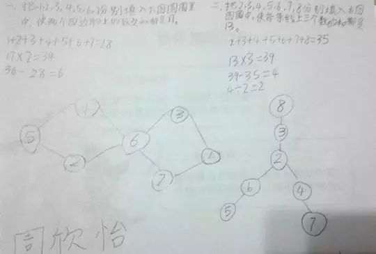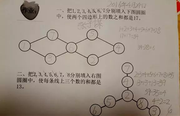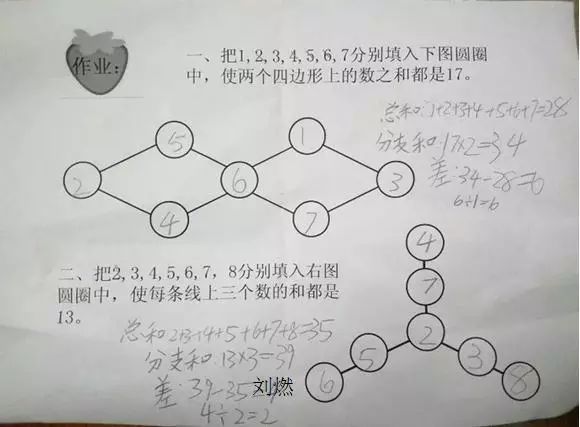 变幻多端的数阵图一直让二年级小朋友们头疼不已,不过,刘燃小朋友用上了所学数阵图魔法口诀里的:“总数分支和不同,中间数字最关键! 先算多的数是几,再数多算有几遍。”过程清晰,一目了然。可见,刘燃小朋友对于课堂内容的理解是多么的深刻呀。