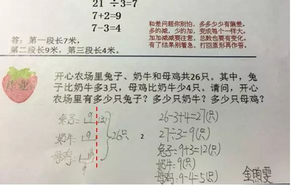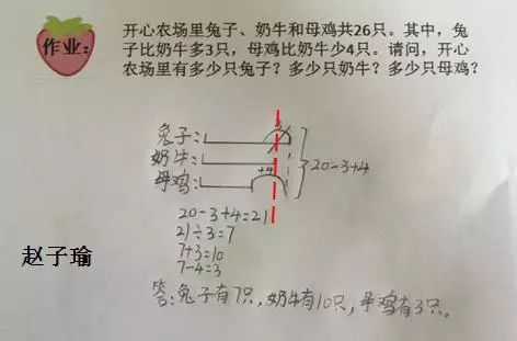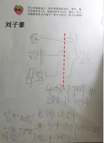 从作业中不难看出,三位小朋友对“多的减,少的加,变成每个一样大。加加减减要注意,总数也要有变化……”的“和差魔法口诀”理解是多么透彻!线段图和题目条件一一对应,让人一目了然。