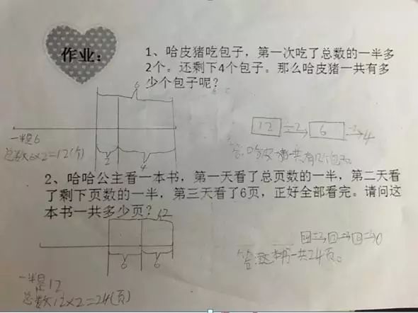 非常佩服倪自勉小朋友的独立,很多次倪自勉小朋友都是自己上课,自己接收作业,自己完成作业后,又自己把作业发到老师邮箱。一个二年级的小朋友,能做到这一点,除了自立性非常强以外,还有着对数学浓浓的兴趣和喜爱。这份兴趣从作业中也不难看出,在上面的作业里,倪自勉小朋友每道题都用了学过的两种方法——“线段图法”和“还原法”来解题。点赞!