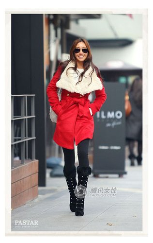 搭配tips:抢眼的paster翻毛领红大衣上身效果超抢眼,下面搭配金属铆钉的高筒靴,明星范儿十足。红与黑的搭配经典不过时。